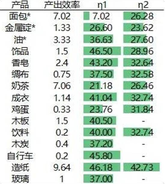 η2对一些产品并不适用,因为木材不能大量生产。这里面包、金属锭和油的数据都是点了相应的累进科技之后的。注意,η2是指全流程都自己生成,η1则是全部购买。
