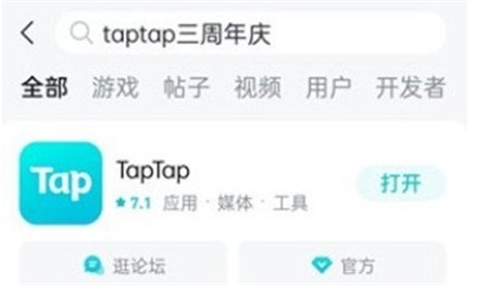 2、在搜索框中输入taptap三周年庆,并点击下面的三周年庆专题进入。