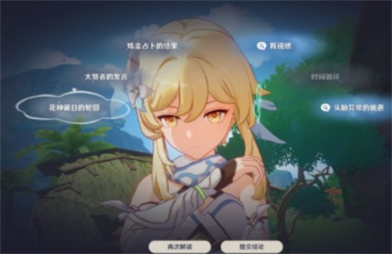 第一次,解读“既视感”,随后联想“花神诞生的轮回”,出现“时间循环”选项,解读并提交即可