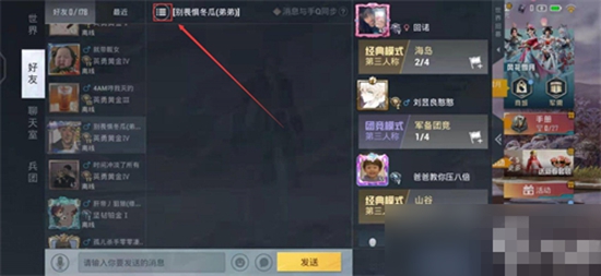 3、进入聊天页面之后,玩家需要点击聊天页面上方的图标,如下。